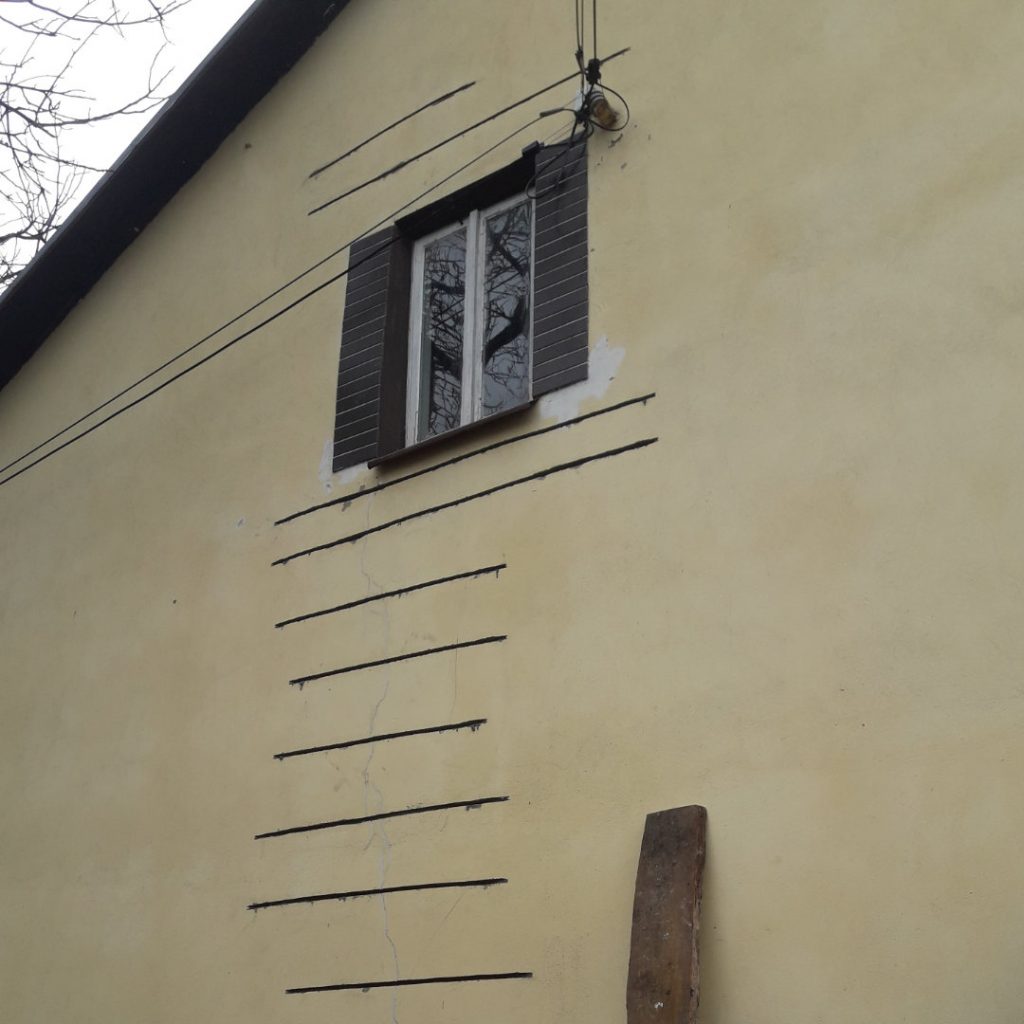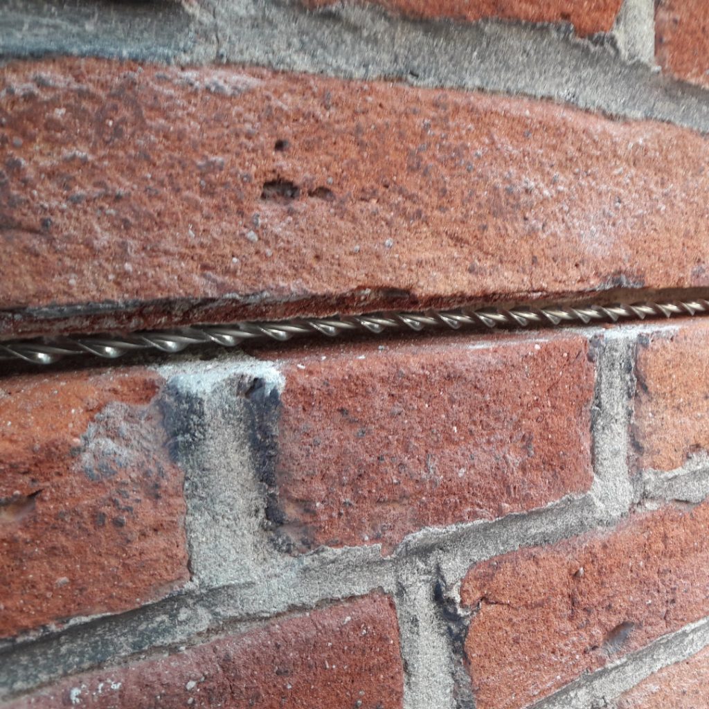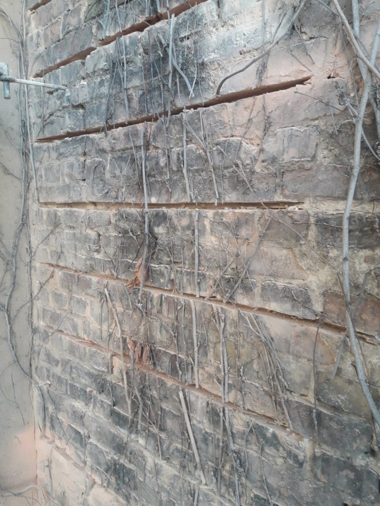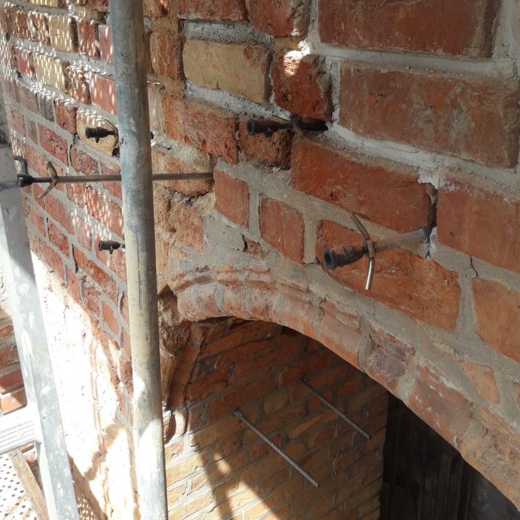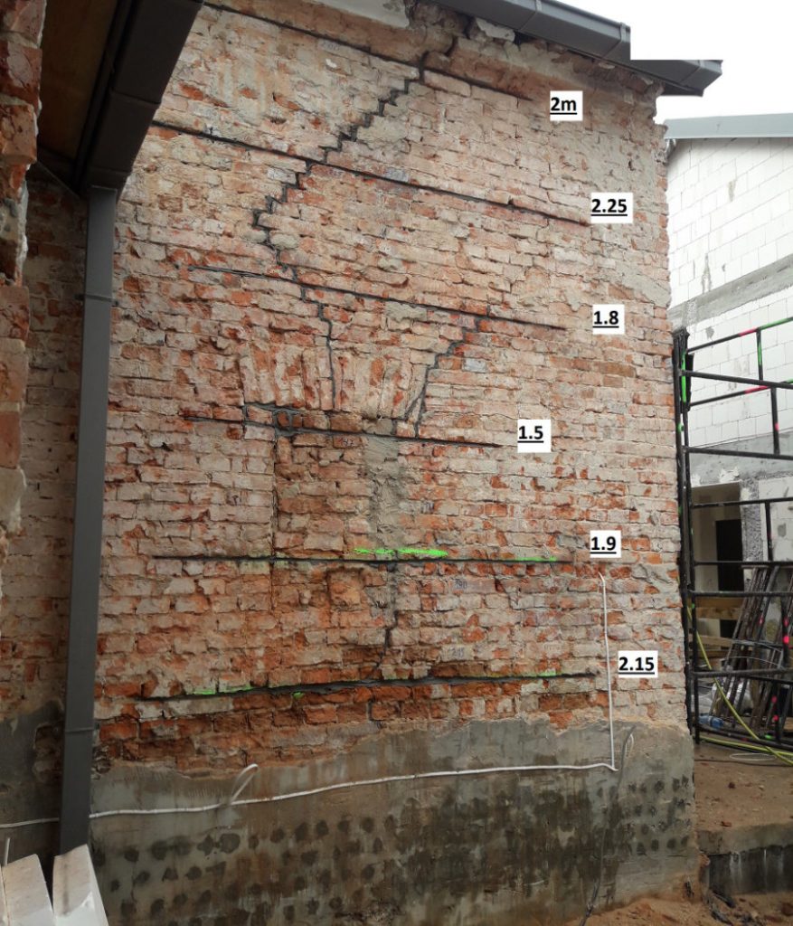 Lokalne szycia wraz z pełnymi parami prętów wzmacniających na wysokości stropu pozwoliły na zabezpieczenie ceglanego muru przed dalszą degradacją.