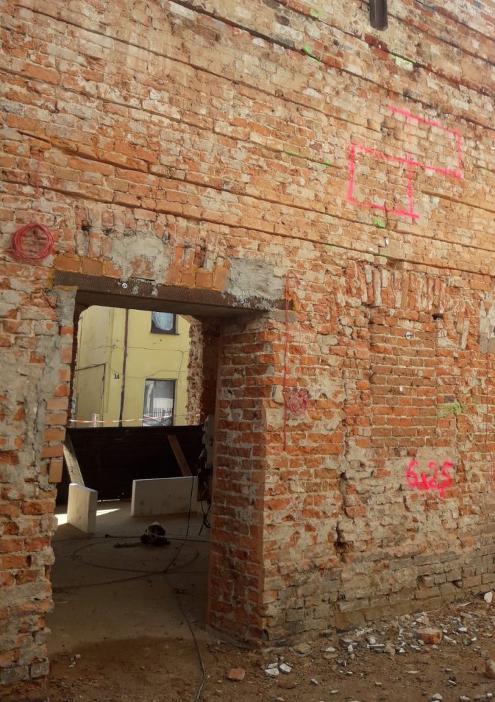 Lokalne pęknięcia w murze ceglanym spowodowane prowadzonymi pracami remontowymi, oraz zmianami warunków gruntowych.