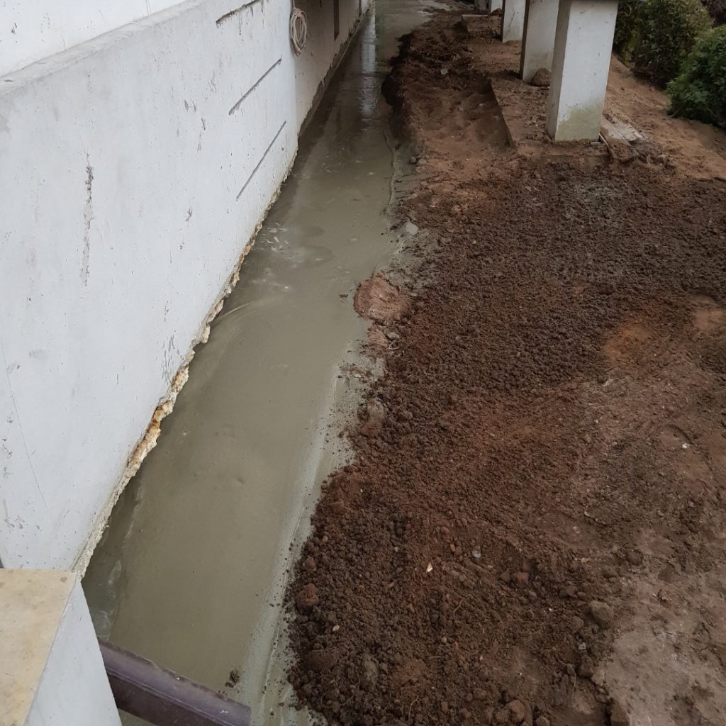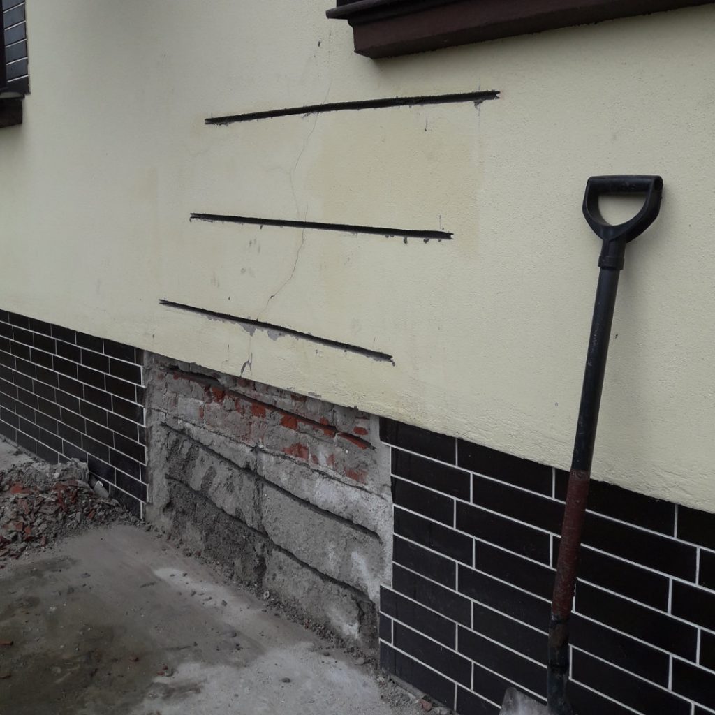 Lokalne naprawy zarysowań elewacji. Dodatkowo osuwająca się wzdłuż skarpy ściana zewnętrzna domu wzmocniona mikrofalami zakotwionymi w wylanej belce żelbetowej. Całość prac zapobiegła powiększaniu się rys na elewacji i osuwaniu się całego obiektu.