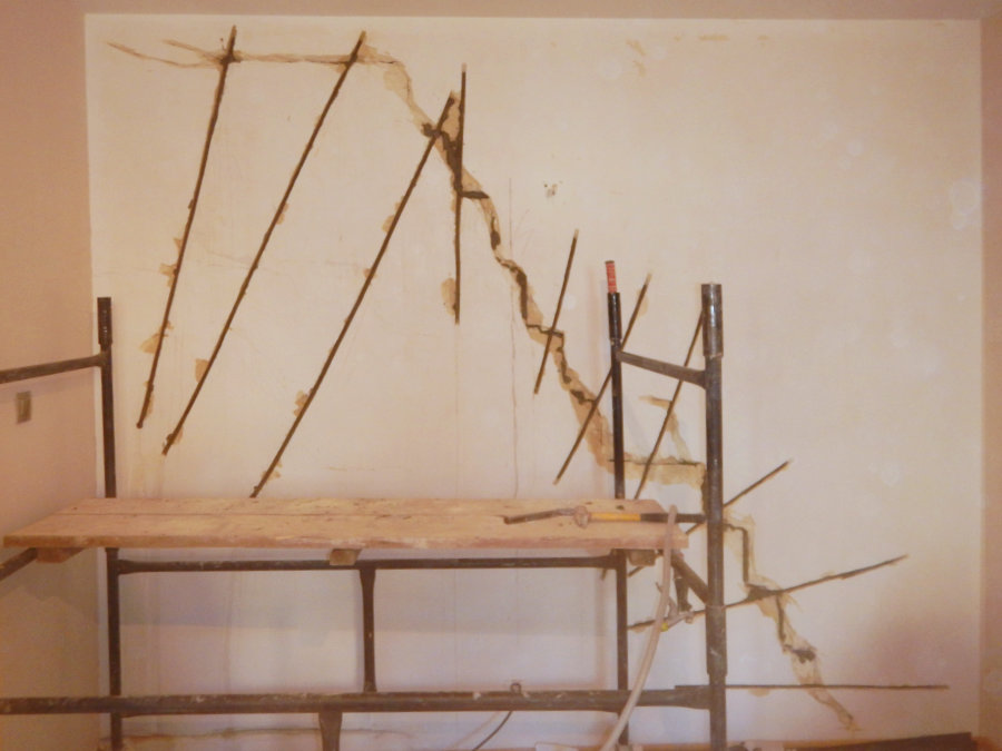 Wykonano obwodowe szycie na poziomie wszystkich stropów oraz lokalną naprawę pozostałych zarysowań.